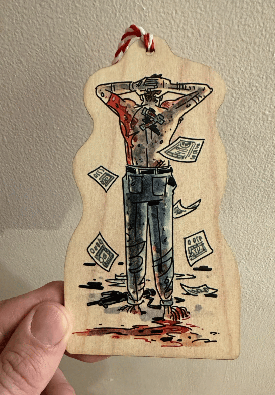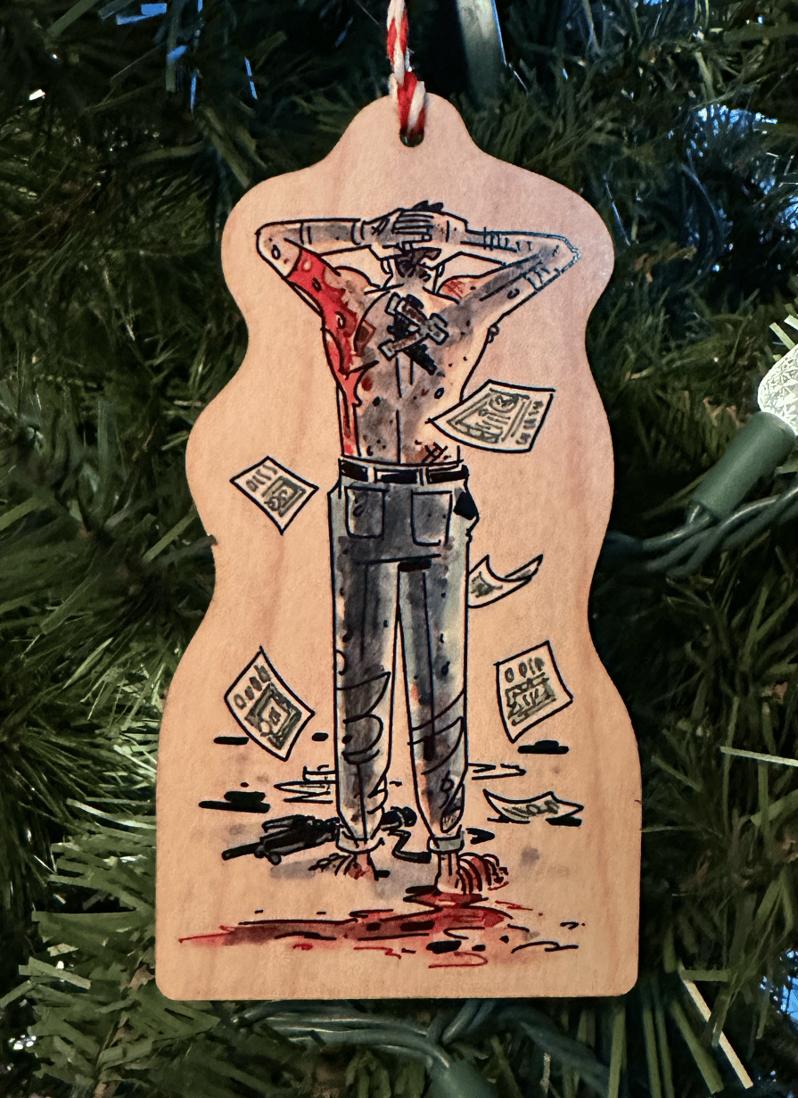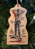Ornament featuring a guest of the 1988 Nakatomi Employee Christmas Party. 1/8" Baltic Birch, approximately 3.25x6" with a 3.5" striped cord.
